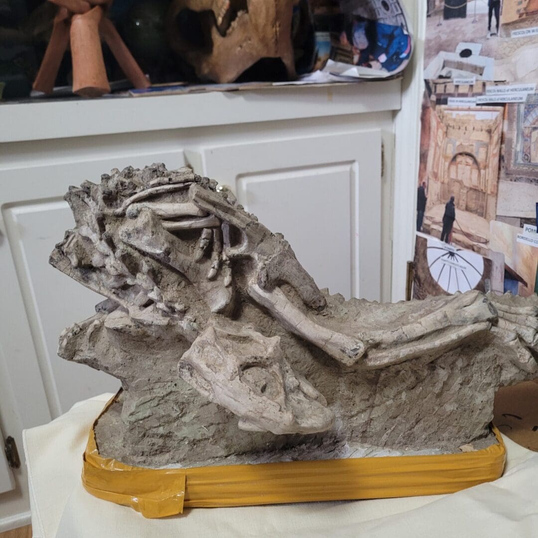AMAZING DEATH POSE LARGE PSITTACOSAUR 32″ ALL NATURAL SKELETON MOUNT w 5″ Head (SOLD)(Shipping not incl)