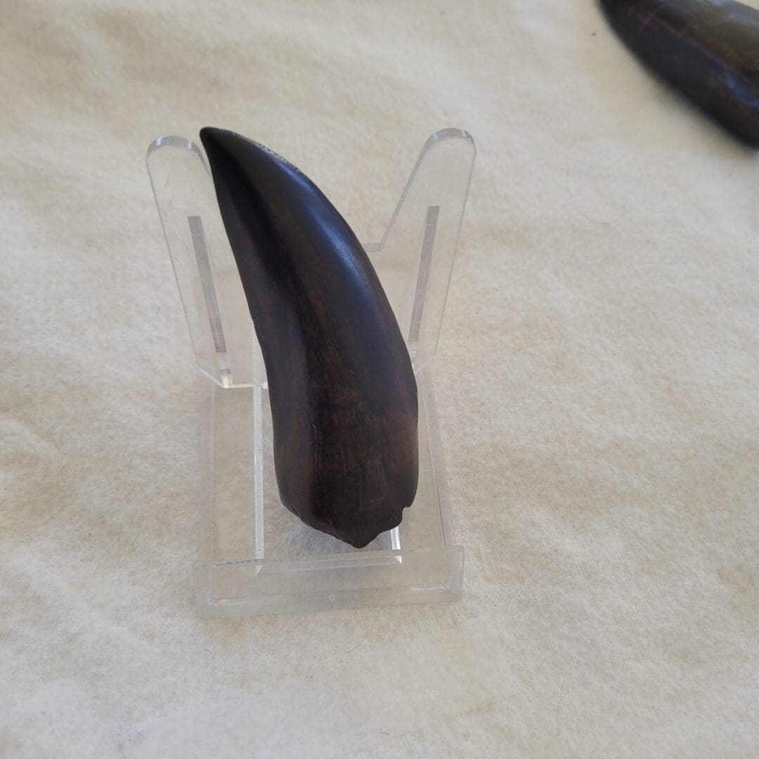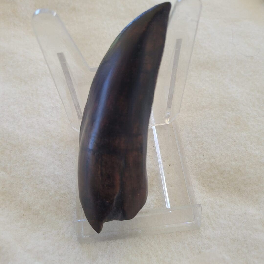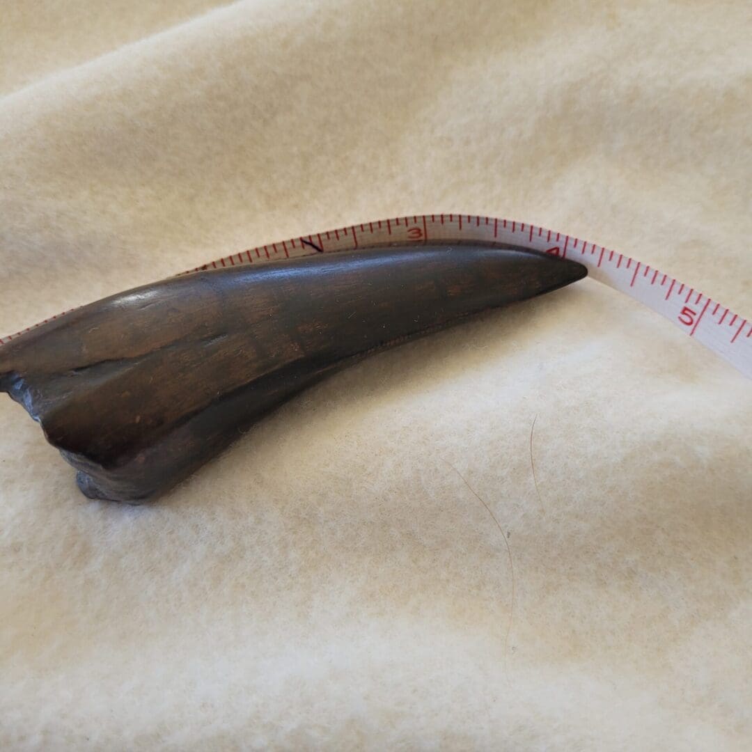 Description and rating: 1-10    8 Long 4.38” Excellent Patina –yes4.5 Inch almost  TREX  tooth  . This is a chance in a lifetime opportunity as this is a nice tooth that does have resto but even has really nice serrations . That is so rare on large tooth w serrations on both sides.  IT is 65% Original with an amazing looking patina as Dark Hell Creek Brown.  The tip is original and back with some middle restoration . It’s for someone who wants a large tooth instead of paying huge  dollars.  Normal 4 3/8 inch goes for 50,000 now. So the astetic value for someone who doesn’t want to pay huge bucks as its beautiful in all regards. If you want perfection it’s not for you ,but looks show perfection of a 65 Million year old item.  This is so much lower for someone who wants quality and a cheap price to show to friends or education purposes.  It is an opportunity you just can’t miss.   It was found by a dino hunter  in  Montana in one of best areas in USA or world on color and quality.  I can’t say enough about this tooth for right person. My last one 4 inches went for this so bigger is better. One this size with no resto sells for 50,000 so a great way to save and see a wonderful tooth