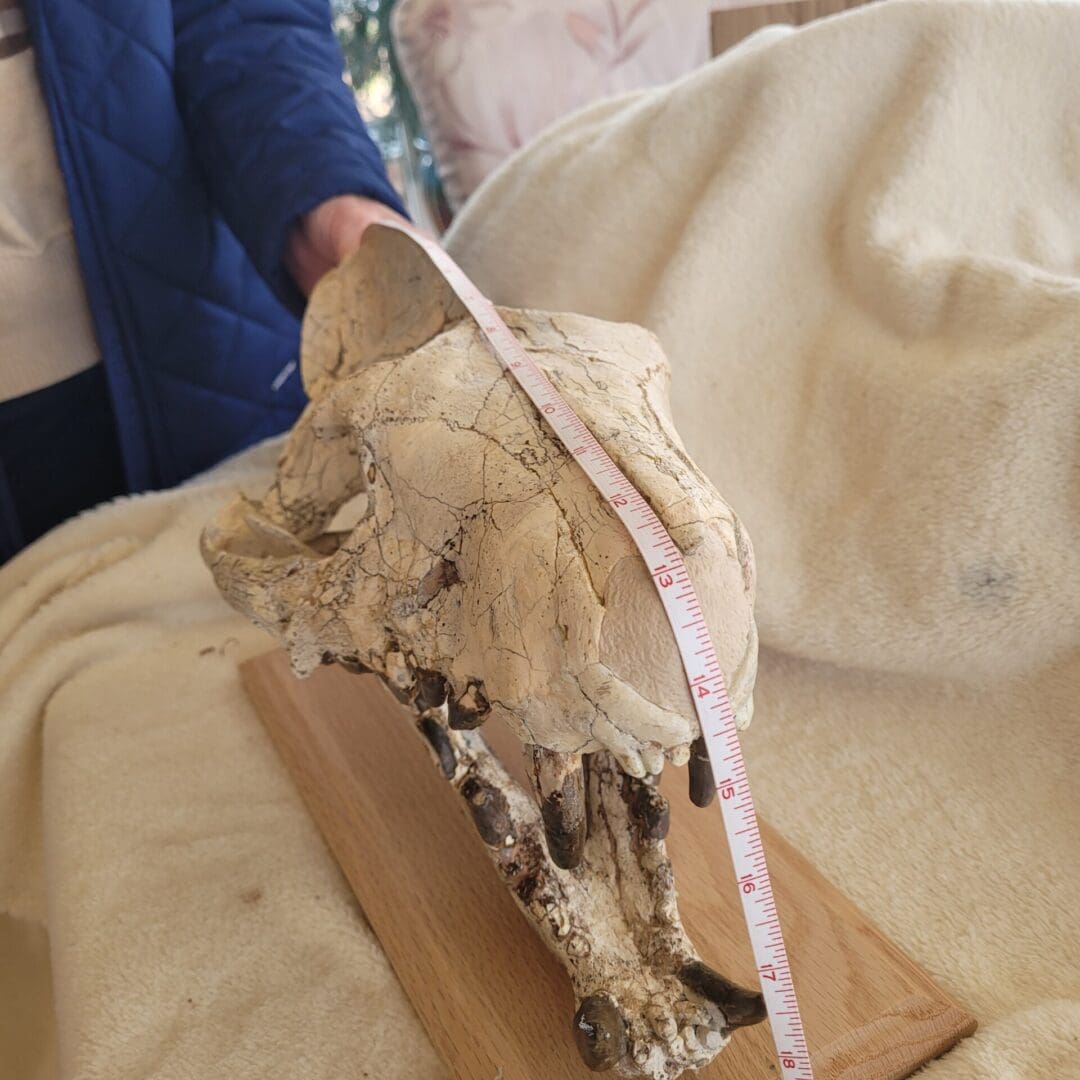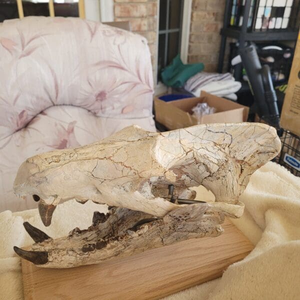 Item rating and description 1-10 9.55 What a vicious creature of Oligocene -The Extinct Largest Hyaenodon, and next to largest carnivore with a colorful 14.5+ inch skull from private landowner . The skull is exceptional on both lowers and upper , with amazing teeth so natural . Only 2 lower teeth are restored . It appears to be an highly Original Skull . 90%. Also this is the largest hyaenodon I ever saw. Anything 75-80% Oligocene is mighty fine. This is going for an amazing price for you an item rarely seen nowadays as only old collections are being sold rarely. The shape, color, and quality is exceptional . This was sold to a satisfied customer who had to enter a nursing home , so a wife’s sold it to me . It’s a great price for such a specimen. Discount possible to a good home Anyone this